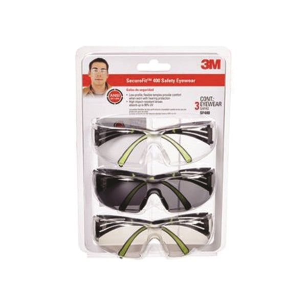Part of the 3M Pro Series, the 3M SecureFit™ 400 safety eyewear is designed with the pro in mind to bring you exceptional performance, comfort and durability. Equipped with our innovative 3M pressure diffusion temple technology, these safety glasses fit comfortably over your ear while providing a secure fit, so you can focus on the task at hand. The pliable arms flex to fit nearly every member of your crew, while Soft-touch nose pads and ear piece inlays deliver all-day comfort. The contoured, wraparound design fits close to your face helping to block small flying objects or particles, while providing essential protection from harmful UV rays. Also, the slim, flexible temples pair well with hearing protection for comfort. These sleek, modern safety glasses are available in three lens types, so there's a pair for a variety of projects. When it comes to your eyes, don't compromise - reach for the protection and engineered comfort of 3M SecureFit™ 400 safety eyewear.
