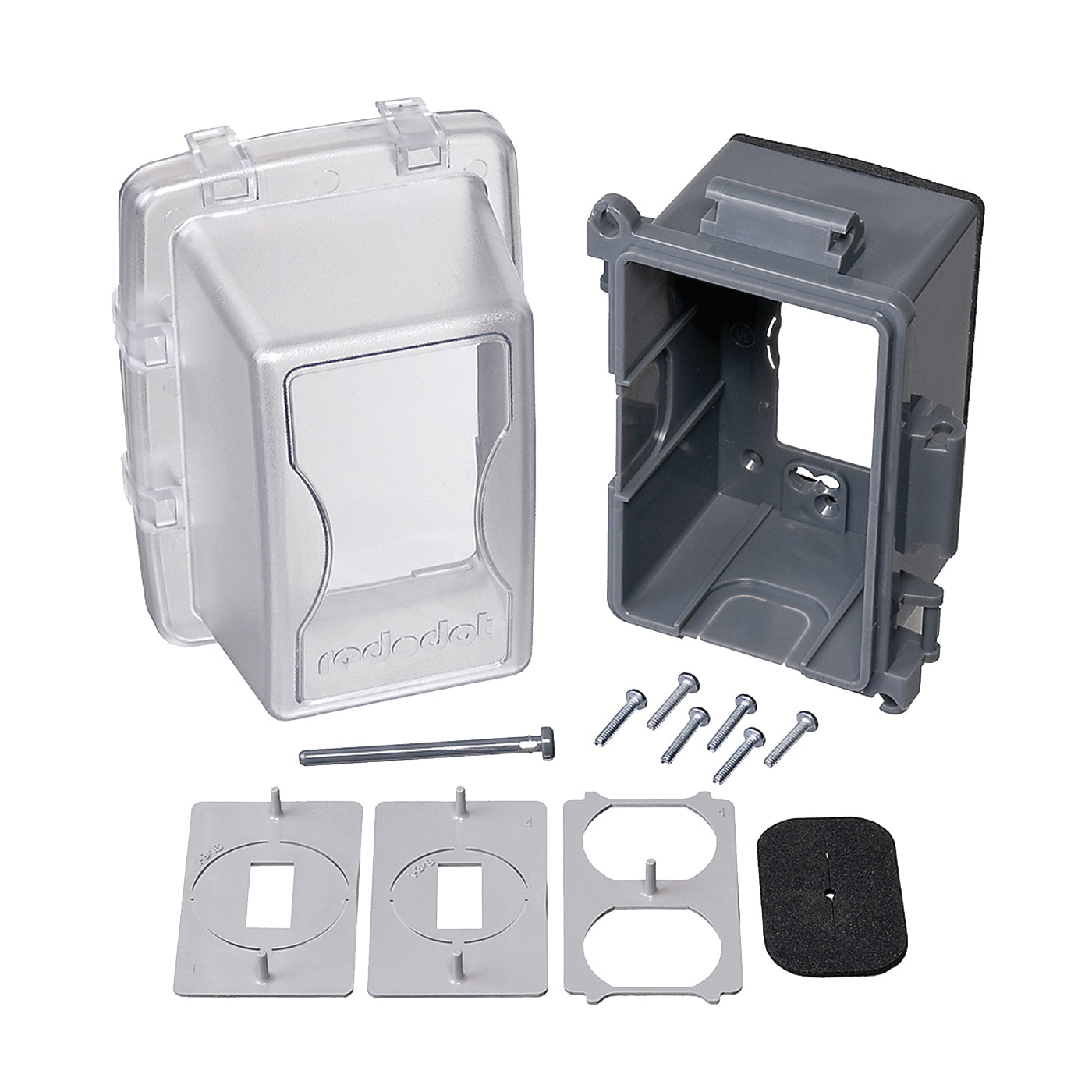 Accepts GFCI, duplex, switch and up to 1-3/8 in round devices. Nonconductive, noncorrosive and impact resistant. Won't rust or fade. Scratch-resistant. For use in wet/damp locations. Keyhole mounts, loosen the existing device screws and slide the cover over. Comes with adapter plates and pre-adhered gaskets. Wasp guard included to keep out unwanted pests. Lockable for security. UL listed.