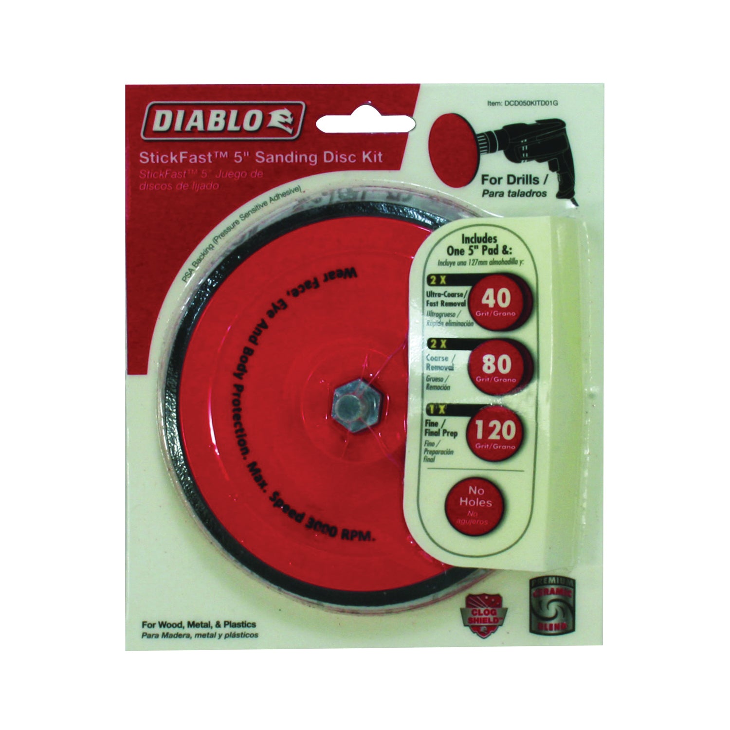 Diablo Sanding Disc Kit, 5 in Diameter, 40, 80, 120 Grit, Ceramic Abrasive, Endura Bond, Applicable Materials: Metal, Plastic, Wood, Includes: (2) Ultra Coarse/Fast Removal 40 Grit Pads, (2) Coarse/Removal 80 Grit Pads and (1) Fine/Final Prep 120 Grit Pad