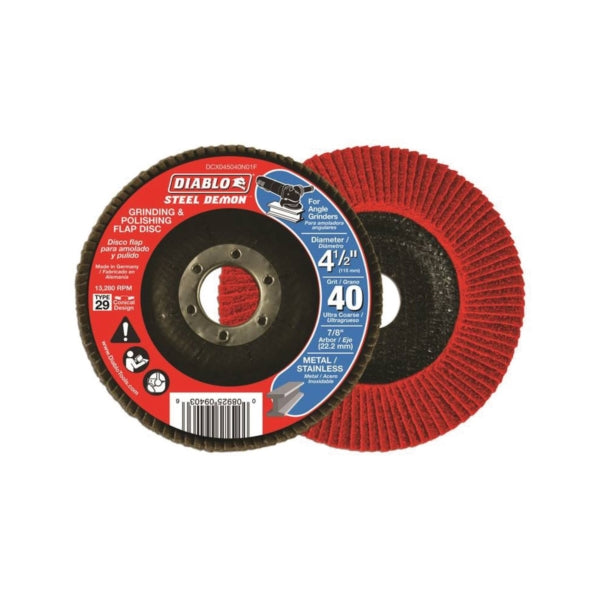 Diablo Steel Demon™ flap discs feature a premium zirconium grain blend for up to 10X faster material removal when compared to standard grinding wheels. The flap discs' special flap design offers flexibility and provides for a cushioned grinding effect. Diablo high-performance flap discs combine two steps in one by simultaneously grinding and polishing.