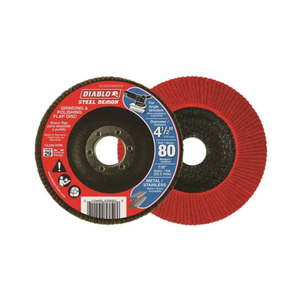 Diablo Steel Demon™ flap discs feature a premium zirconium grain blend for up to 10X faster material removal when compared to standard grinding wheels. The flap discs' special flap design offers flexibility and provides for a cushioned grinding effect. Diablo high-performance flap discs combine two steps in one by simultaneously grinding and polishing.