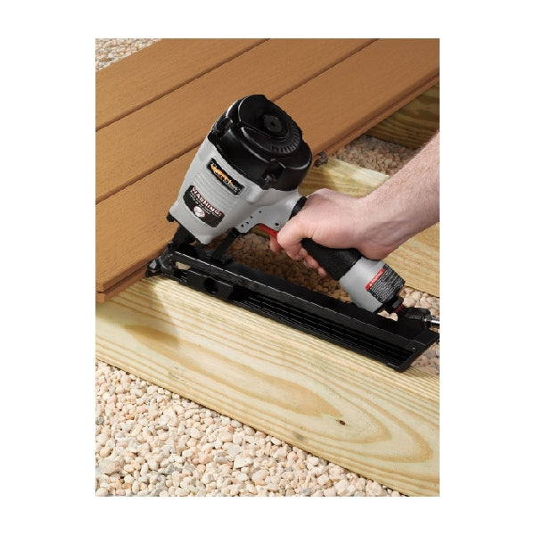 The tool features a unique nose piece that holds clips in the correct position every time, firing a screw nail (scrail) through the clip into the joist, fastening the deck board to the joist in one step. On average, this installation gun will install about 400 sq-ft of decking in an hour.