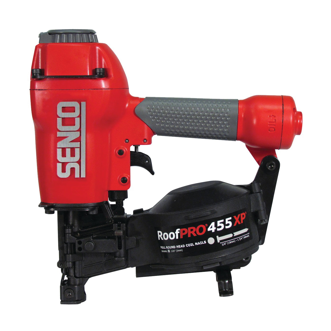 Aluminum housing with over-mold comfort grip and trigger. Tool oil required. 360 deg adjustable exhaust. 9-3/4 in L x 9-3/4 in H, weighs 5.4 lb. Operating pressure is 70 to 120 psig (4.8 to 8.3 bar). Contact actuation operation. Drives 11 ga (0.120 in), Smooth shank, full round head roofing nails 3/4 to 1-3/4 in. Includes tool oil and wrench.