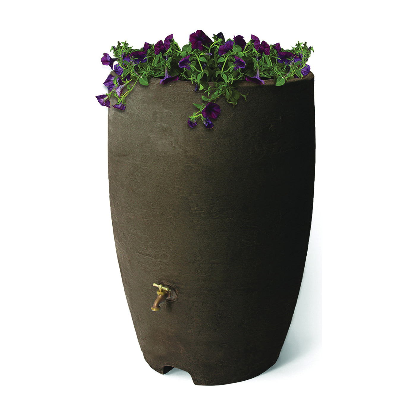 Designed to give you the classic look of ceramic with the ease and durability of plastic, the Athena 50 gal rain barrel is made of rotomolded plastic which is able to withstand harsh temperature changes and won't chip, fade or crack. Included is a high-quality brass spigot that adds to the elegance of this rain barrel as well as a shut-off nozzle and corrosionproof screen guard. All Algreen rain barrels are equipped with two overflows to allow for linking multiple barrels or installing with an Algreen Deluxe Diverter Kit. The Athena 50 is compatible with the Algreen rain barrel pump kit for pressurized watering.