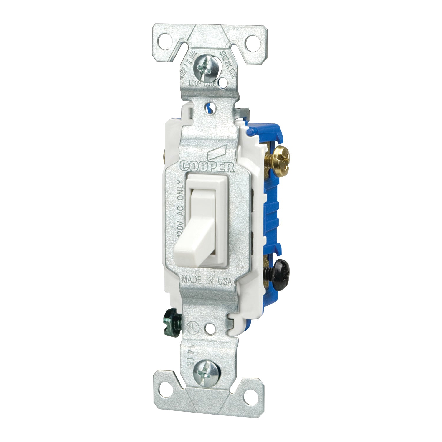 Longer, wider strap on toggle switches provides 40% more contact area to wallboard. Virtually eliminates floating installations. Industrial design cam-action mechanism insures quiet switch action. Patented built-in wire stripper for #14 and #12 wire to speed installation. Unbreakable top and bottom housing eliminates call-backs due to jobsite breakage. Patented built-in wire looper for pre-looping. Three-way switches feature additional push-in common termination for feed-through tapping. Push-in terminals accept #14 solid wire only. Side wire terminals accept up to #10 solid or stranded wire. Tri-combo screws accept slotted, Phillips and Robertson head tools for installations in both the US and Canada.
