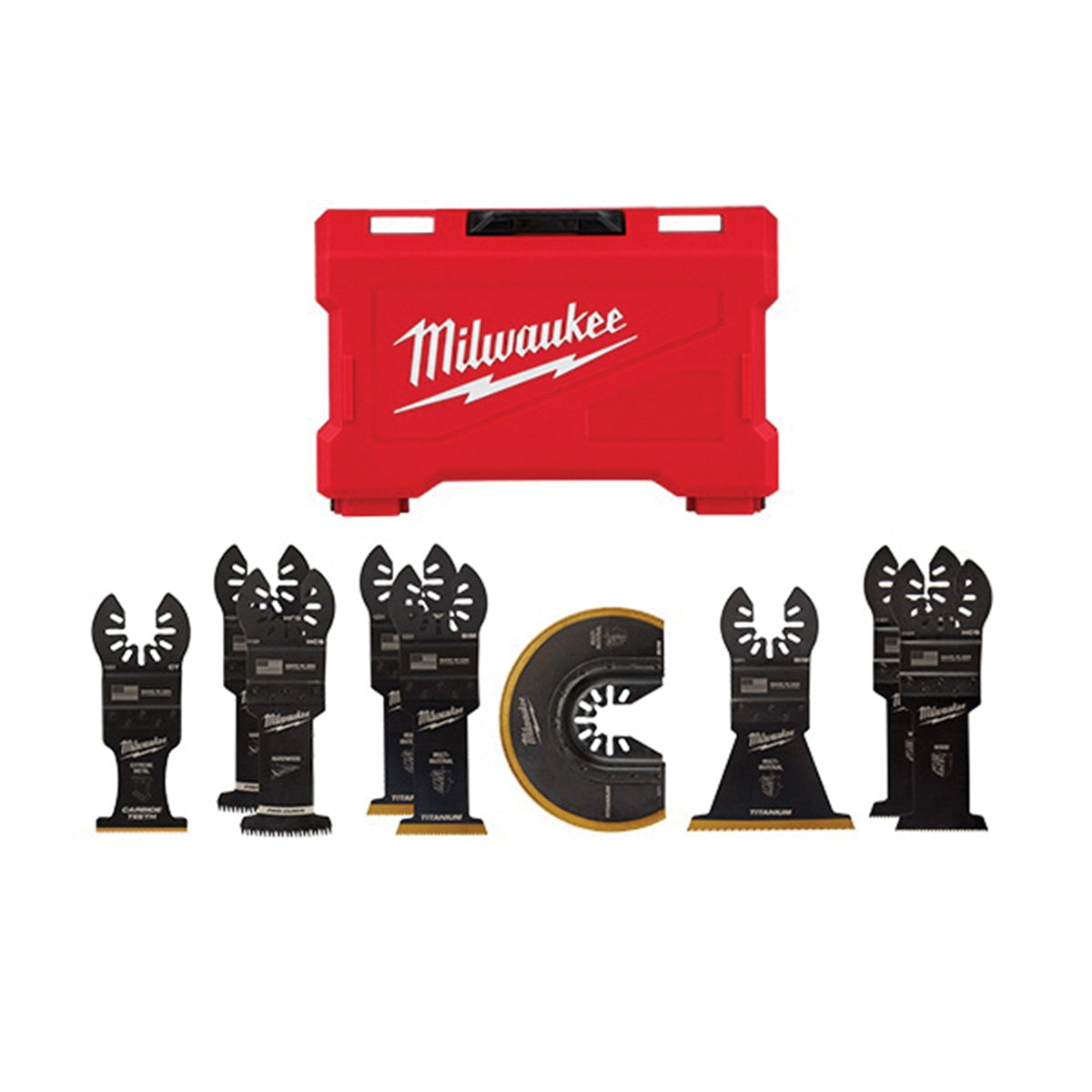 Our universal fit OPEN-LOK™ nine-piece oscillating multi-tool general-purpose variety pack offers you a versatile assortment of top-performing oscillating blades. The included titanium enhanced carbide teeth blade is designed to last up to 50X longer in extreme metals compared to standard bi-metal blades. The carbide teeth are ideal for cutting screws, bolts, metal pipe, nails and more. The titanium enhanced bi-metal blade uses premium HSS and lasts up to 15X longer than standard HCS blades. The bi-metal blade is ideal for smooth cuts in wood and nails, PVC and drywall. The segmented blade is great at maintaining a long straight cut, cutting up to corners and flush cutting. The triple-ground Japanese tooth blade delivers up to 2X faster cuts than the previous Milwaukee HCS blade and features a PRO-CURVE™ cutting edge for greater control. Ideal for fast, clean cuts in hardwood and can also be used in other woods, PVC and drywall. The oscillating wood blades have been designed with aggressive, precision ground teeth for fast cuts in wood, drywall and PVC. This MILWAUKEE® oscillating tool blade variety pack is designed and made in the USA with global materials and includes a storage case.
