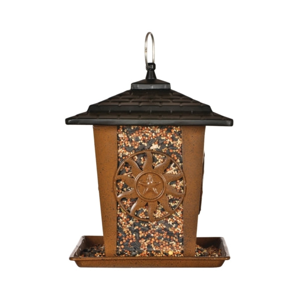 The Perky-Pet® Sun & Star lantern bird feeder holds 3 lb of seed and has a wide perching area to allow for more birds to feed at one time. The seed tray also has small holes to allow any access moisture to drain from the seed, which makes it a great feeder for areas that get a lot of snow or rain. The celestial inspired design on the lantern style birdfeeder is sure to keep the birds flocking to your yard every day. With its attractive design, it's a great addition to your outdoor decor. The all metal construction gives this feeder a modern look, yet makes it extremely durable and rust-resistant.