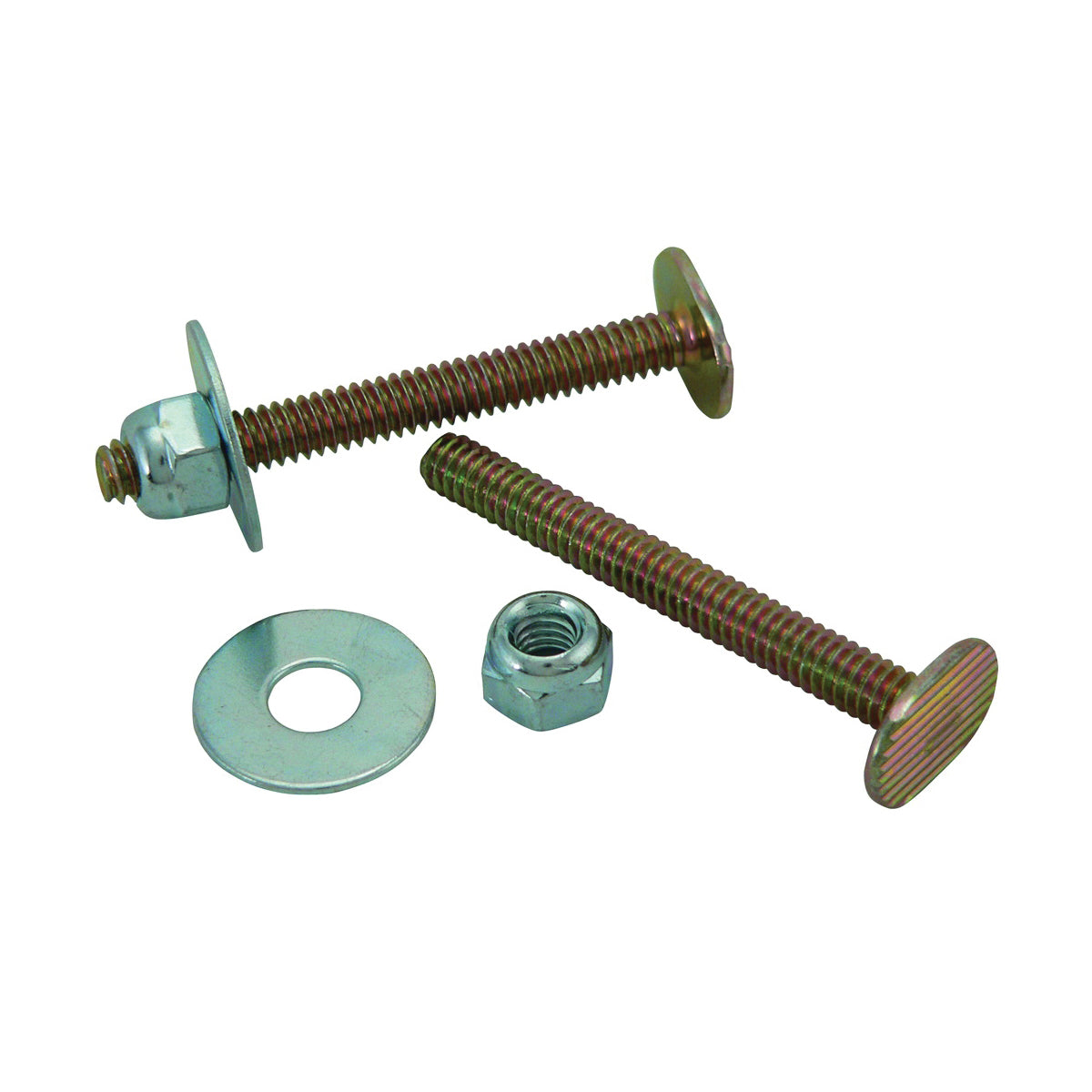 Includes two brass-plated bolts, two washers and two nickel-plated nuts.