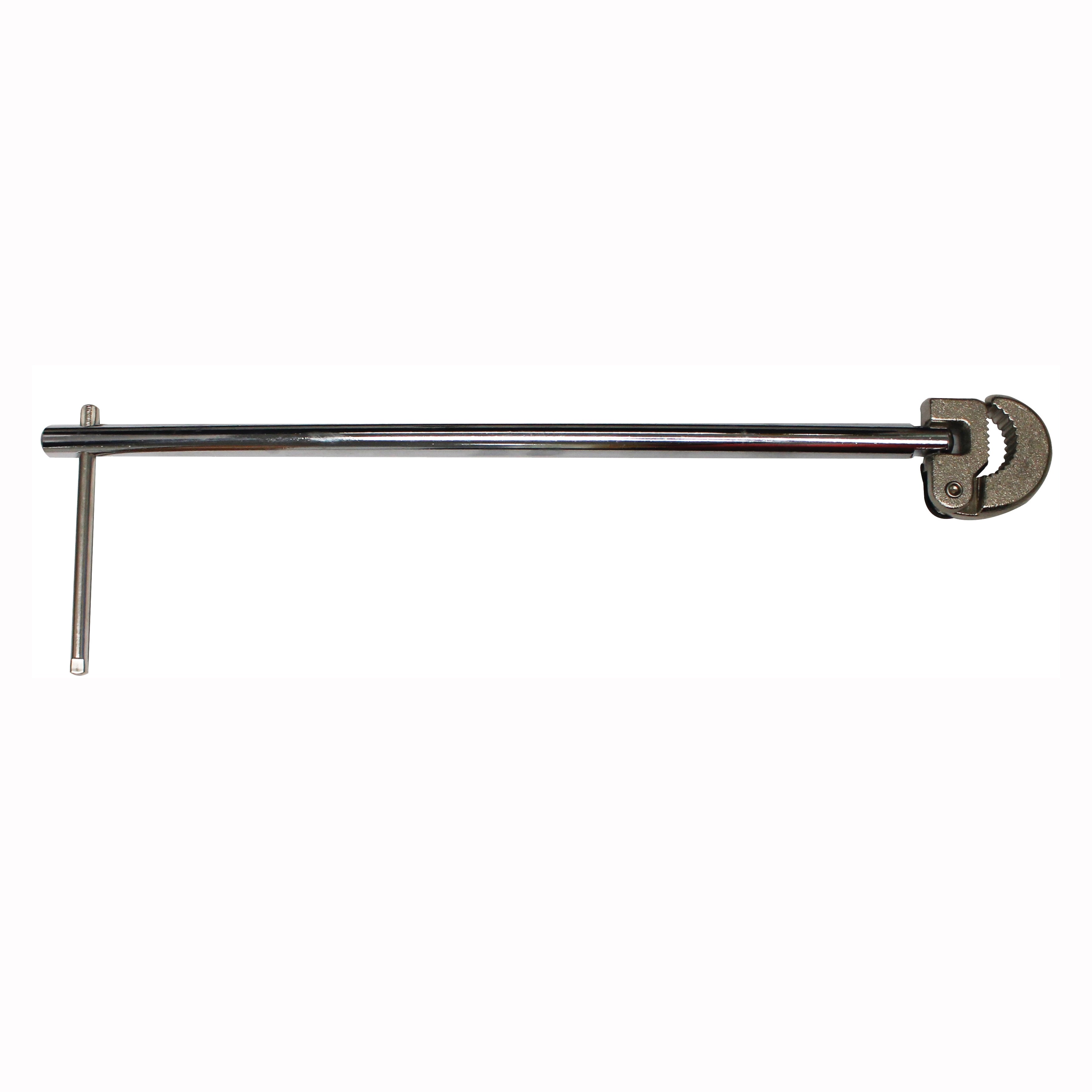 15 in basin wrench. Spring loaded jaw grips tightly to faucet nuts. Pivoting head positions for both removal and tightening. Long handle offers an extended reach. Carbon steel handle.