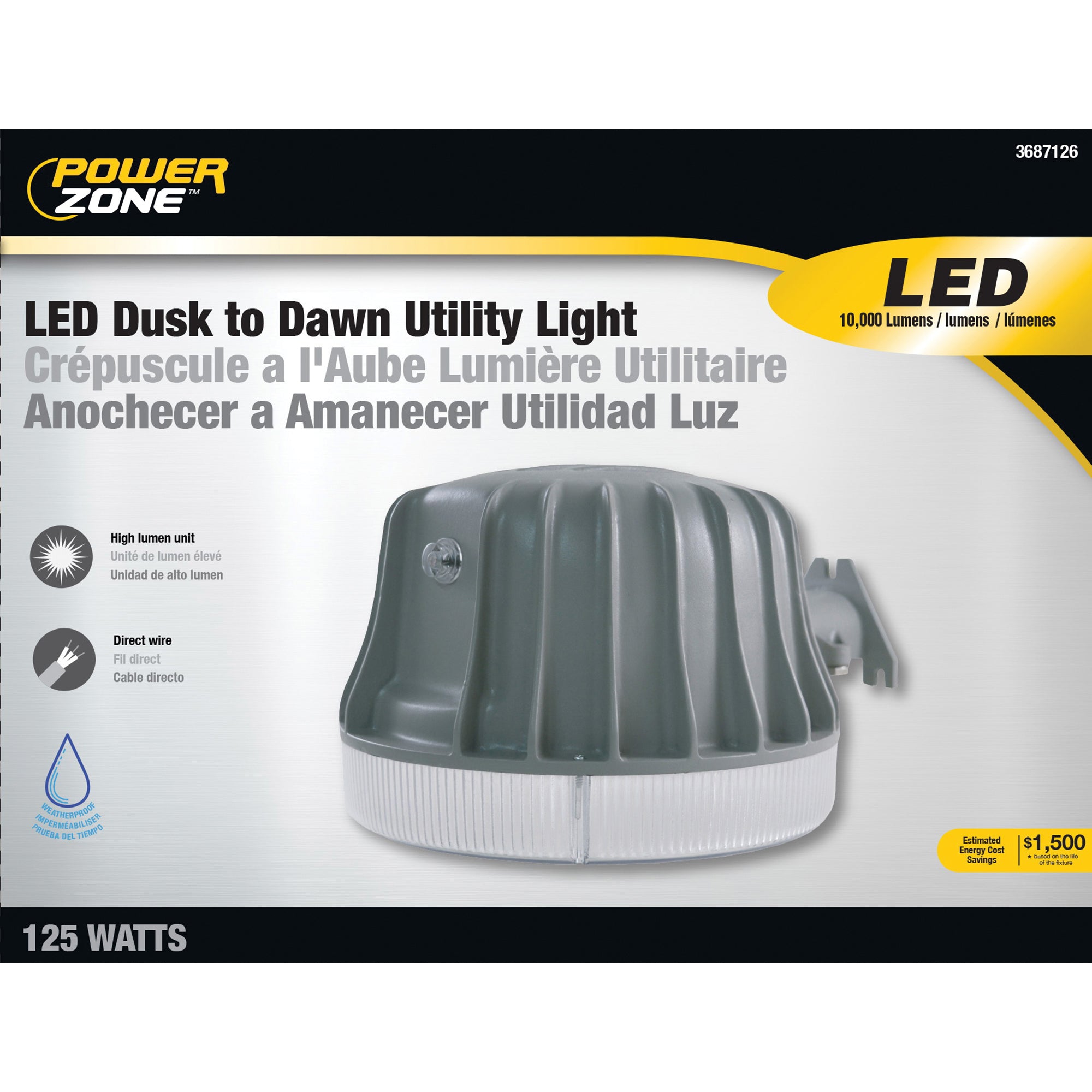 The Power Zone Dusk to dawn activated light will provide seamless light coverage for increased safety, security and peace of mind. Easy to install, this light produces 12000 lumens by using only 125 watts. Perfect for indoor and outdoor use.