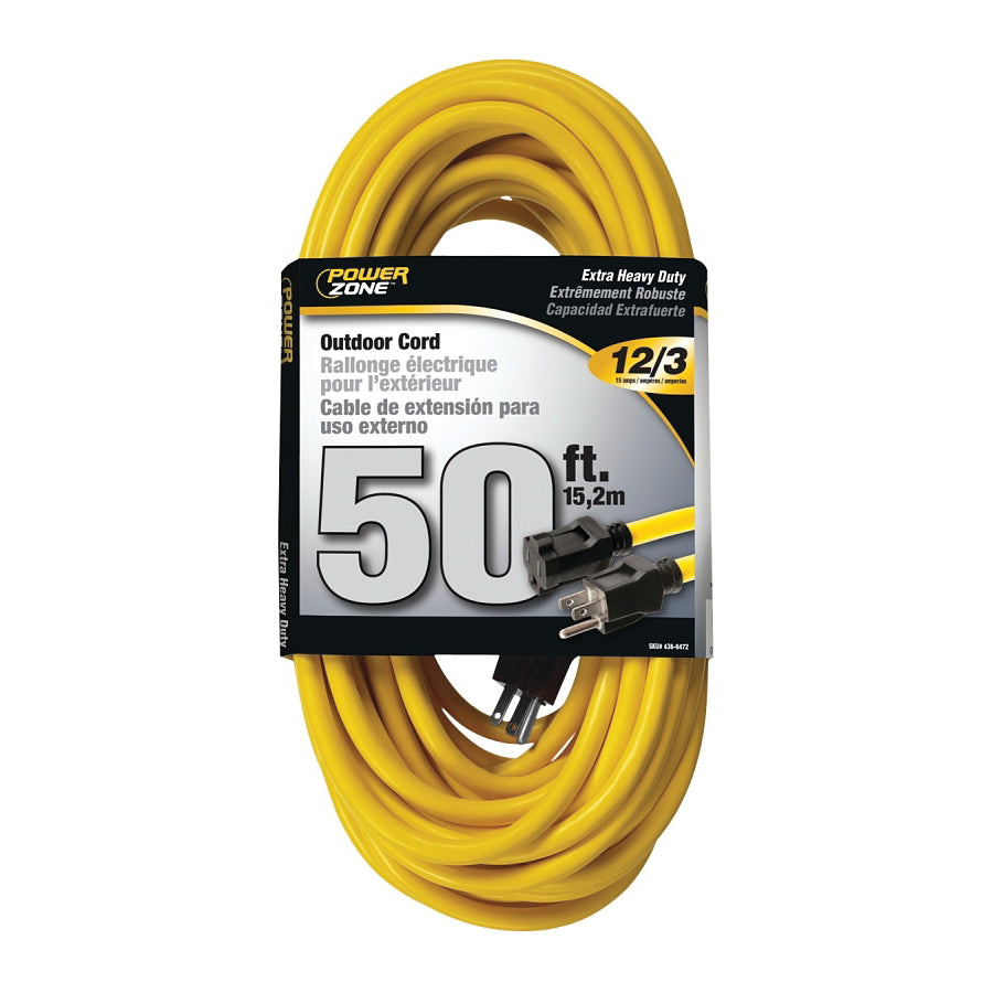 • PowerZone OR500830 Extension Cord, 12 AWG Cable, 50 ft L, 125 V, Yellow