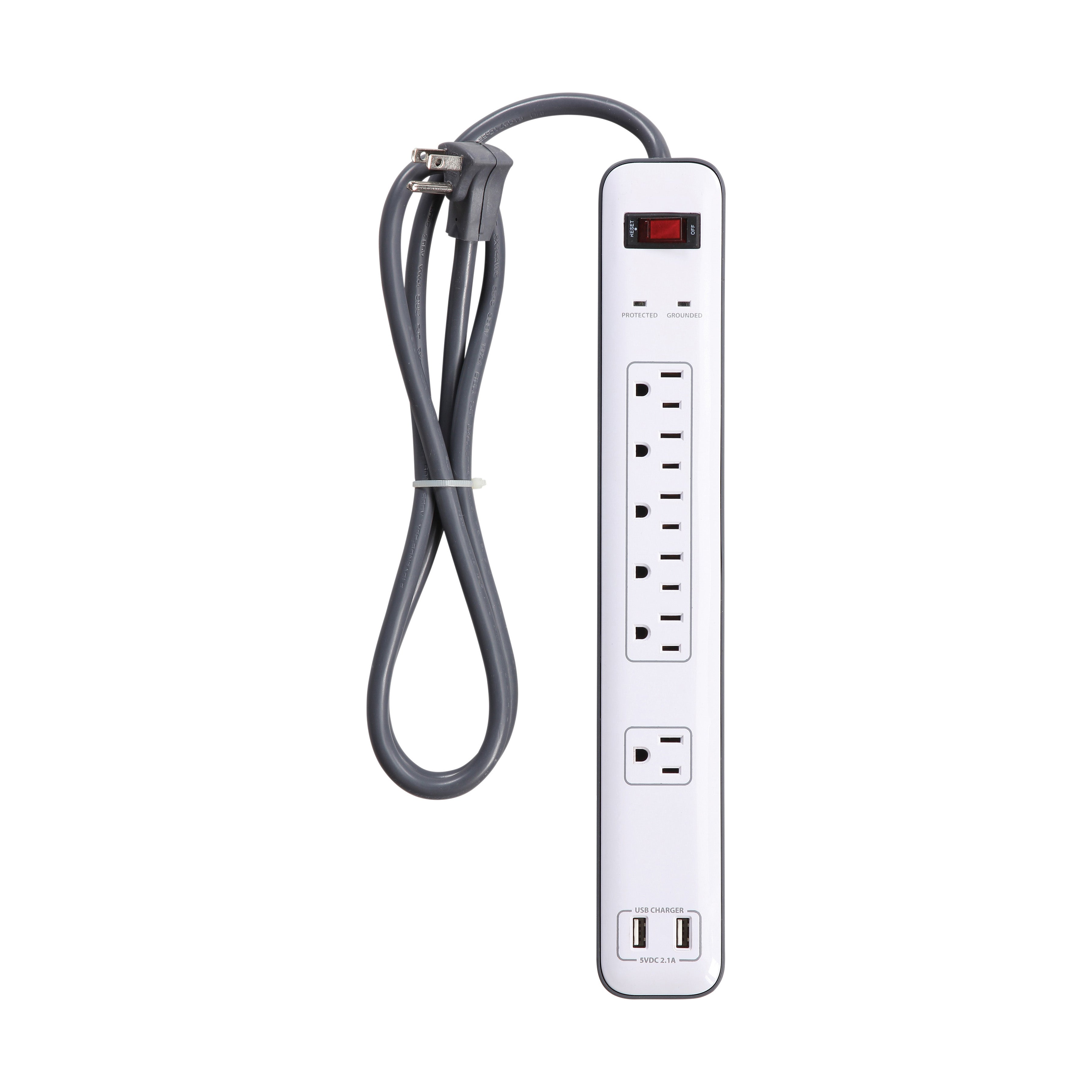PowerZone 6-outlet Multimedia Surge Protector has 1800 Joules of surge protection and powers your computer or home entertainment system, plus a 2-port USB charger to keep your cell phone and tablet fully charged.