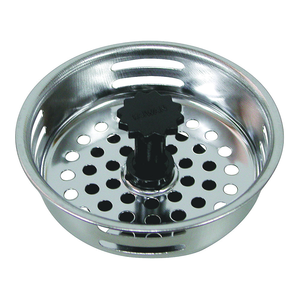 This ProSource strainer basket can work as a kitchen sink stopper or sink strainer by pushing it down or pulling it out a bit. Compared to the stem tab type of strainer stopper, the spring clip structure plunger makes it easier to swift from stopper to strainer. Push it into the bottom, it's a stopper, pull it out a bit, it's a strainer. The diameter of this kitchen sink drain strainer fits most standard sink drains with a narrow rectangular hole in the center. This kitchen drain stopper is made from solid stainless steel construction which is built to last. A chrome plated finish gives a delicate metal texture, which perfectly matches your sink style. This kitchen sink drain catcher traps food debris to prevent clogs in your sink, draining water easily through the 32 bar holes on the basket.