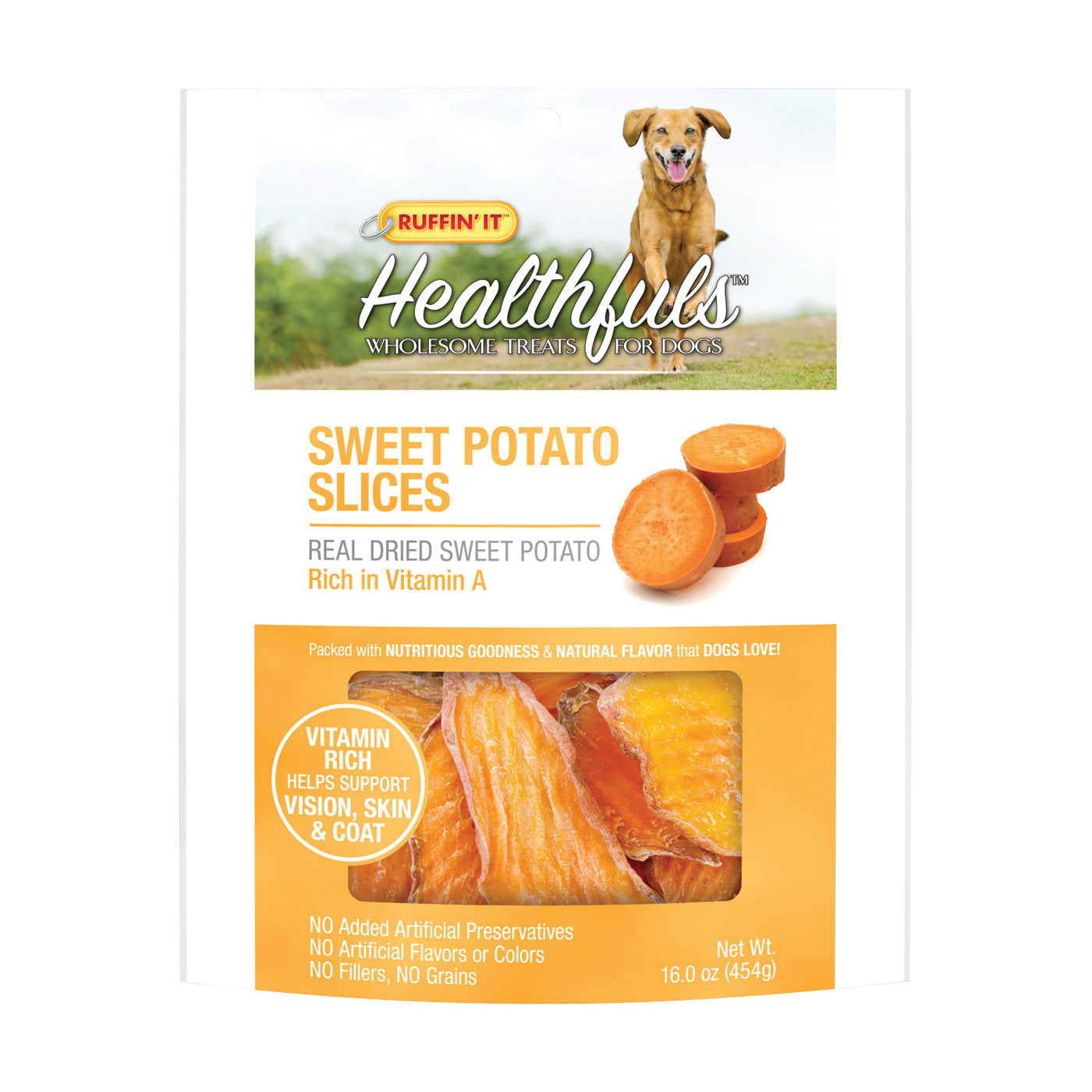 Wholesome treats for dogs. Made of real dried sweet potato. Rich in vitamin A to help support vision, skin and coat. Contains no added artificial preservatives, fillers, grains, artificial flavors or colors.
