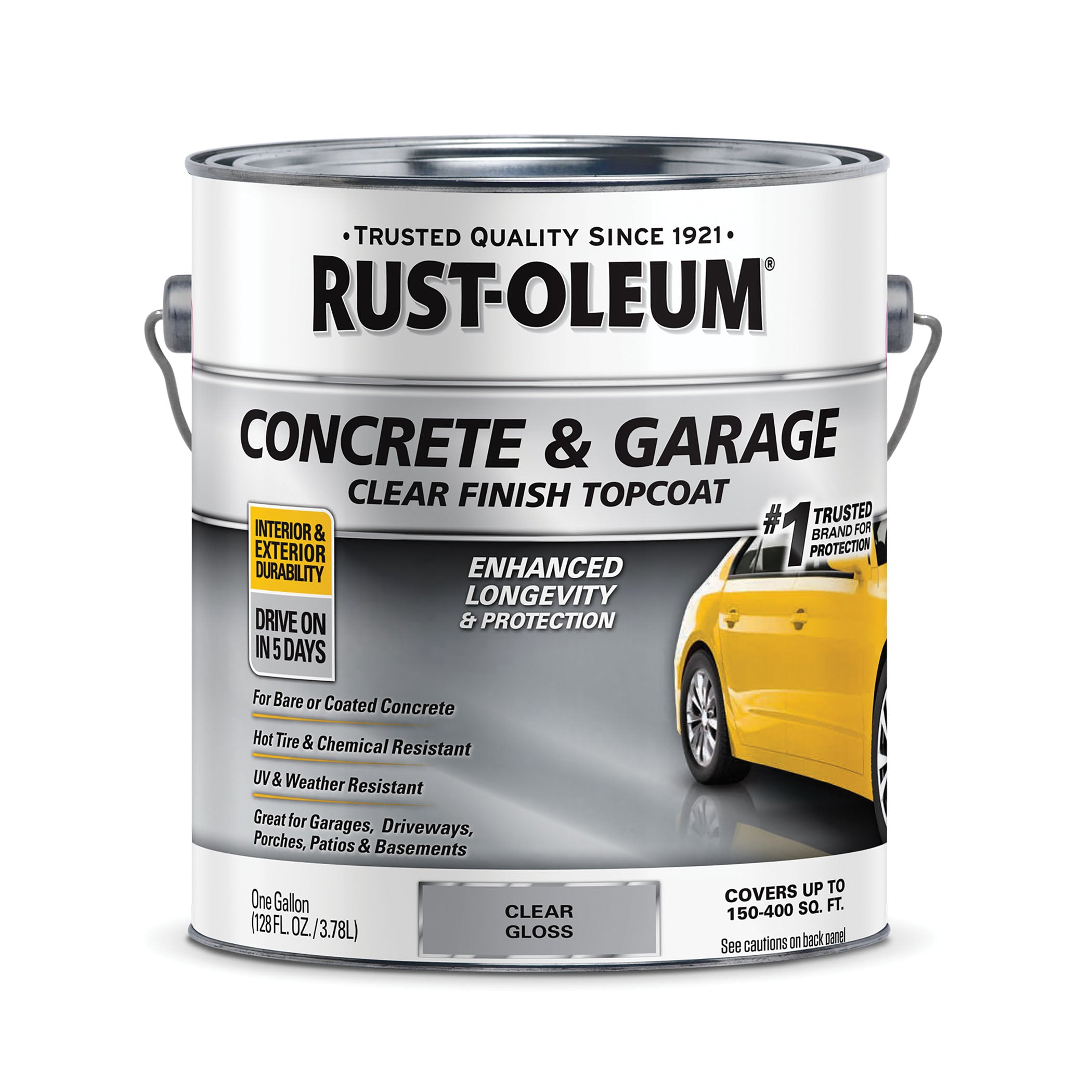 RUST-OLEUM clear finish floor topcoat is a ready-to-use clear protective coating for use on garages, carports, driveways, basements, porches, patios, walkways and pool decks. It is designed for use over bare concrete or over one-part floor paints such as RUST-OLEUM concrete and garage floor paint to add a protective, gloss finish that resists damage from hot tires, motor oil, grease and gasoline. The durable, UV and weather-resistant gloss finish is easy to maintain and resists fading and peeling.