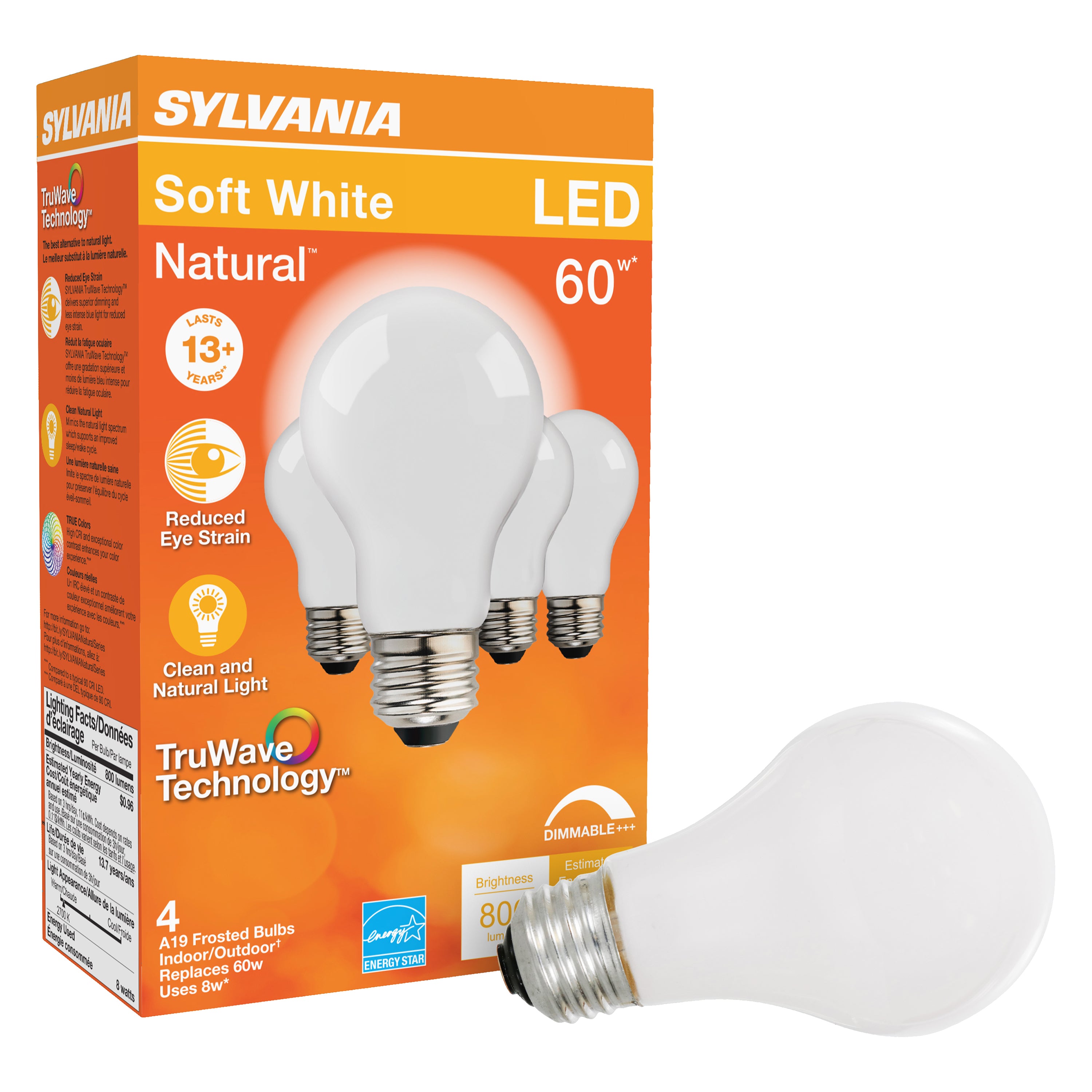 Sylvania LED Bulb, General Purpose, Wattage Rating: 8 W, 120 V, Lamp Base: E26, Lamp Shape: A19, Lamp Finish: Frosted, Lumens: 800 Lumens, Dimmable: Dimmable, Light Color: Soft White, Color Temperature: 2700 K, Average Life: 15,000 hr, Includes: (4) LED Bulbs