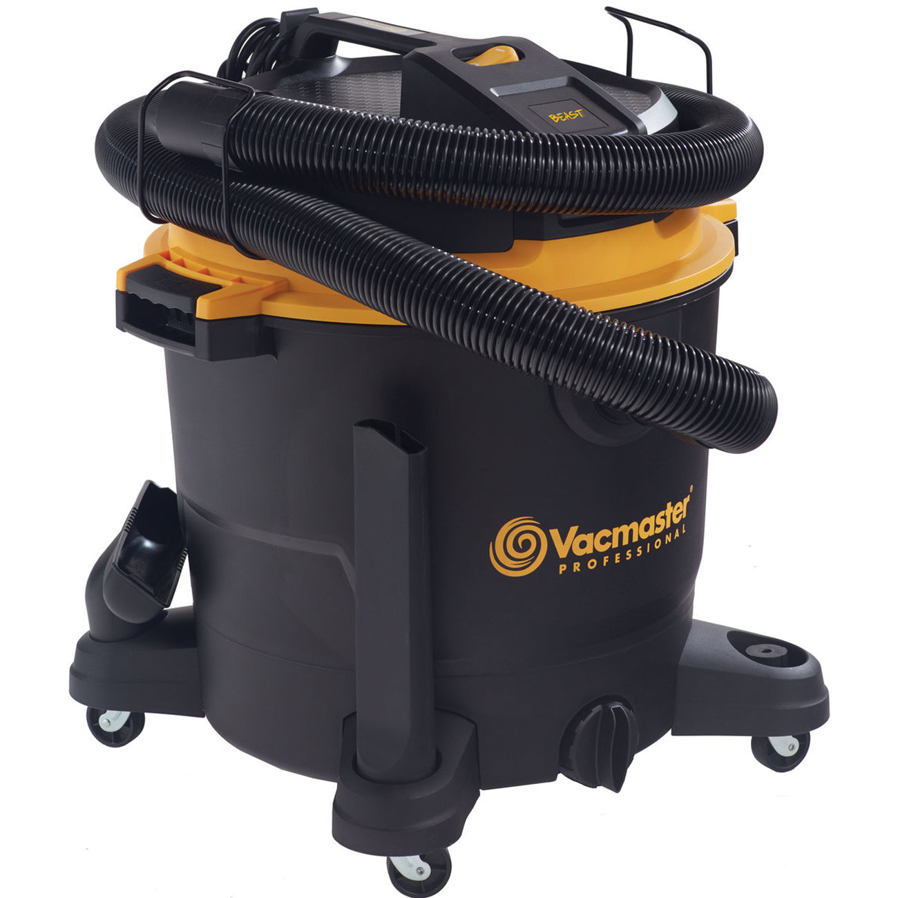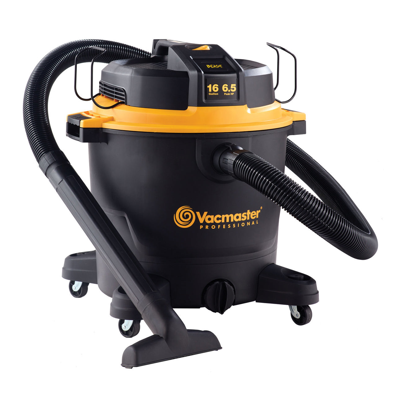 This Vacmaster Professional® Beast Series™ 16 gal 6.5 peak HP wet or dry vacuum is a powerful high-performance vac designed to tackle the toughest cleanup projects - at the jobsite, around the shop or in the garage. On-board hose, accessory and power cord storage eliminates unneeded hassle and minimizes total storage space. A unique flat power head design allows you to conveniently store tools on top of the vacuum so they are easily accessible when needed. Over 28 ft of cleaning reach allows you to reach farther without unplugging the unit. Quickly control the power with the large dust sealed on or off switch. Heavy-duty 360 deg swivel casters improve mobility on most surfaces.