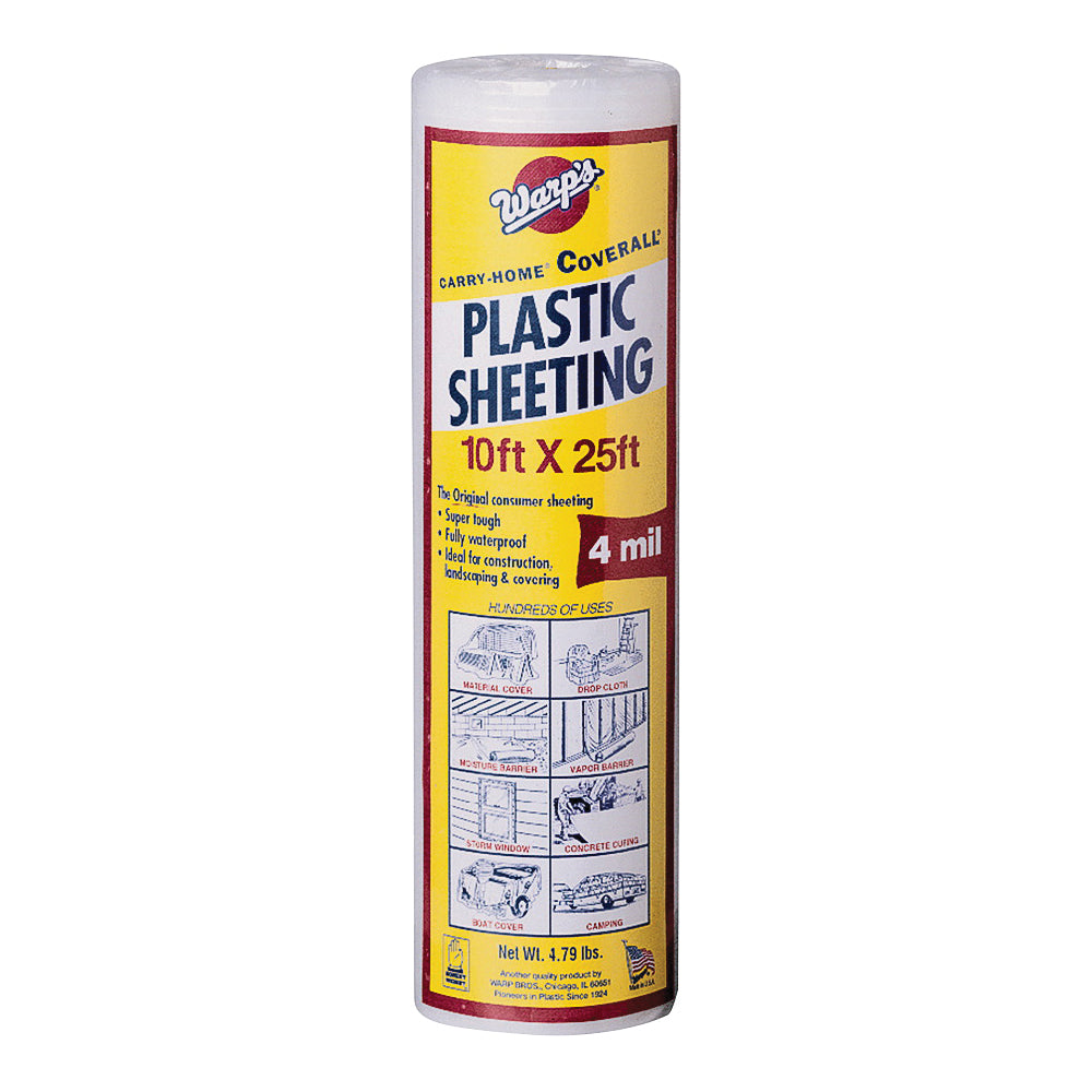 Super tough, fully waterproof plastic sheeting used by DIYers and contractors for large and small construction, landscaping or covering projects. Warp's shelf-pack, wrapped on a solid core, will sit upright on a shelf or horizontally in a bin with vertical design on front panel and horizontal on rear for flexibility in displaying. Consumer.