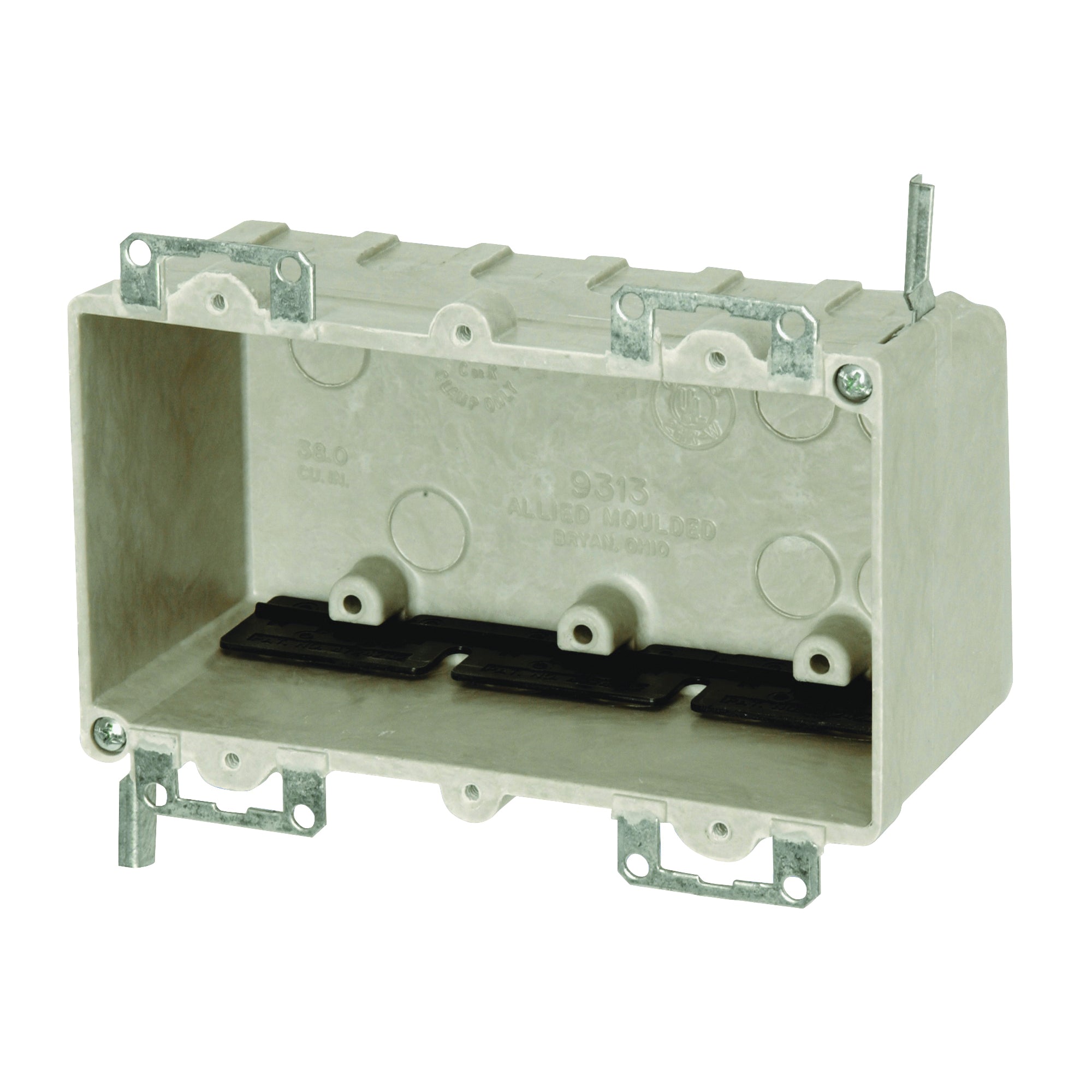 Thermoset fiberglass with ears, wing brackets, speed clamps. Lightweight, non-corrosive, non-conductive, no ground required. Will not melt or distort in high heat. Shatter-resistant in cold temperatures. 2 hrs wall fire rating. 2-7/8 in x 5-15/16 in x 3-1/4 in. UL listed.
