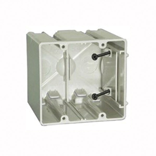 Molded of engineering grade non-metallic thermoplastic. Adjustable, no need to remove or relocate mounting screws to re-position the box. Slots retain slider plate and guide it in a straight motion. Internal rails guide slider plate for smooth mounting adjustability in wall substrates from 1/2 in to 1-3/8 in thick and ceiling substrates from 1/2 in to 1-5/32 in. Square corner design allows easy wall cut-in (Old work applications). Molded spline device holes for quick device screw installation. 42 cu-in volume, two 1/2 in knockouts. Internal steel, stud/wood screws. 3-9/16 in D x 4 in W x 3-3/4 in H. UL listed for 2 hrs fire resistive walls.