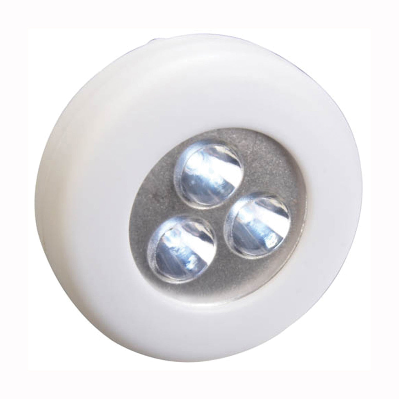 Metallic colors. Tap lens On/Off. Includes hook and loop squares and double-faced tape for mounting. 3 LED bulbs, 3 AAA batteries included.