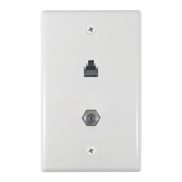 The flush mount ethernet wallplate with white finish connects a CAT 5/6e ethernet cable and coax cable through a wall. The dual inputs allow for increased versatility and the flush mount design ensures an organized and professional look for your ethernet cables. Screws are included for mounting.