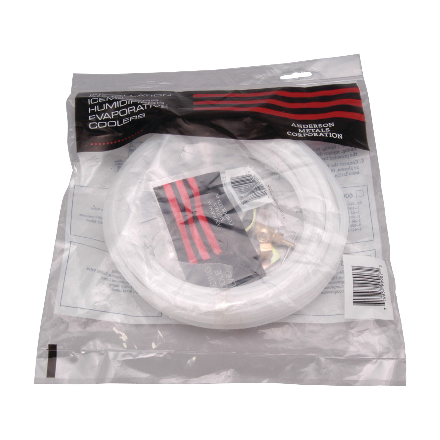 Hook up water supply to existing ice maker in freezer. 25 ft Polyethylene tubing. One 104SCSD self-tapping saddle valve, one 62 1/4 compression union, three 60P 1/4 Delrin sleeve and three 61P-1/4 brass insert. Bagged.