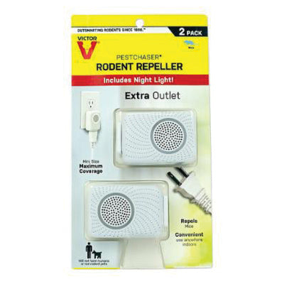 The Victor® PestChaser® rodent repellent with extra outlet effectively drives away rodents by emitting a highly irritating noise that can only be heard by rodents. This ultrasonic repellent is non-toxic and poison-free making it a humane option for your rodent control needs. The PestChaser® is easy-to-use, all you have to do is plug it in and it will immediately start to deter rodents. Each plug-in repellent is equipped with a nightlight feature that emits a soft illumination which also lets you know the product is working. Plus, there is an extra outlet on the bottom so you never have to sacrifice plug space.