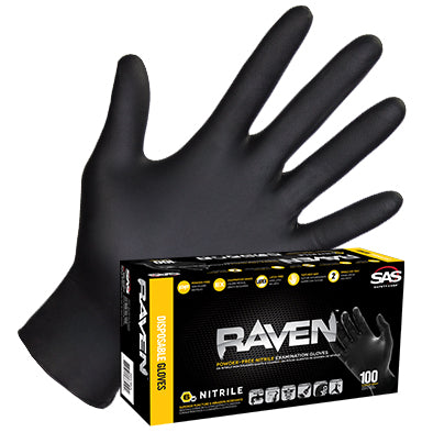 SAS Safety Corp Raven Disposable Gloves, Size: L, Nitrile, Powdered/Powder Free: Powder-Free, Black, Latex Free: Yes, 6 mil Thickness, Exam Grade, Resists: Abrasion, Chemical, Package Quantity: 6 PK
