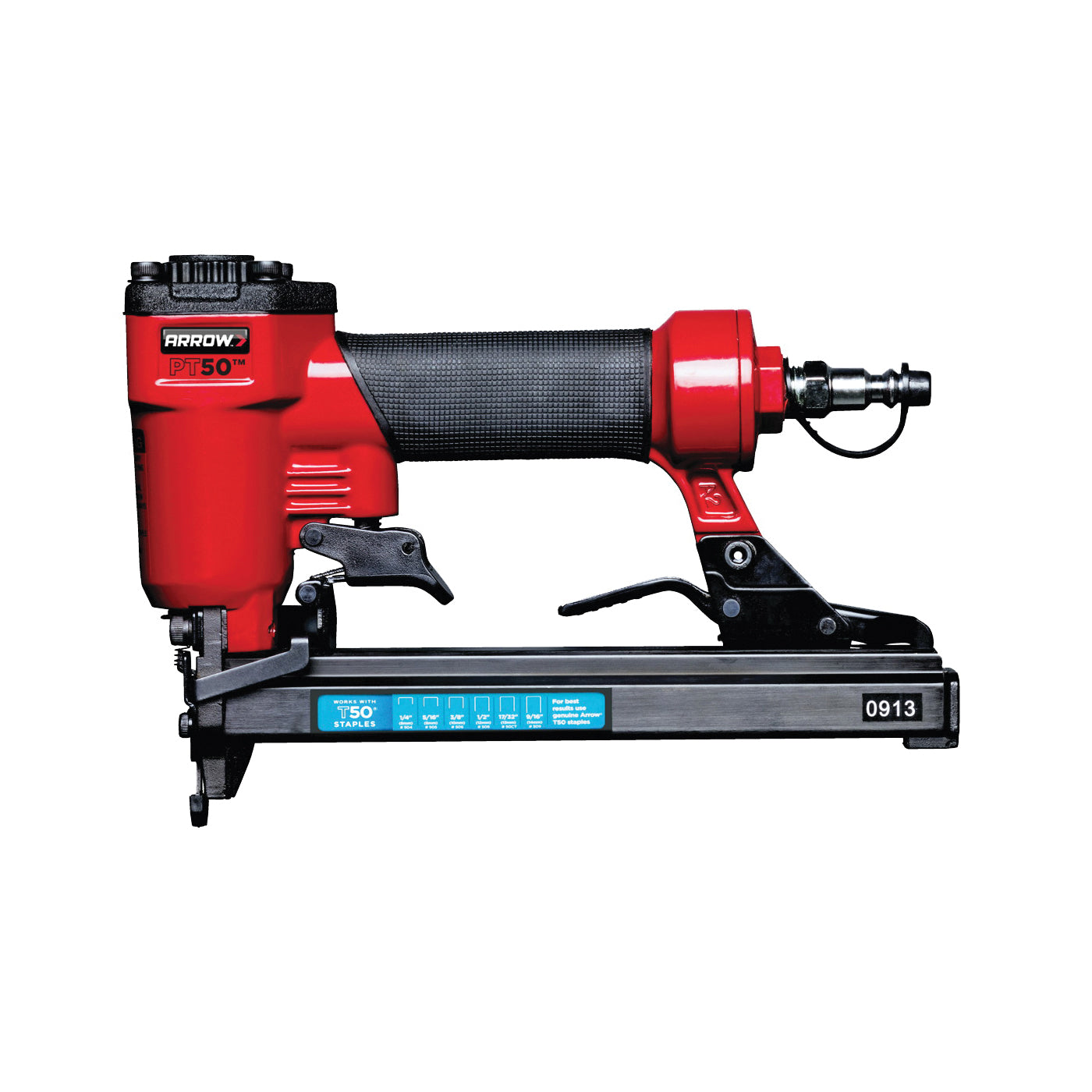 The Arrow PT50 delivers serious pneumatic tool performance at a price everyone will love. Packed with features like an easy-load magazine, overmolded comfort grip, adjustable exhaust cover and contact safety. This tool has the power and versatility to tackle any home project. And, it's capable of bump firing to speed big jobs along. PT50 comes with all necessary fittings and operates on home compressors up to 120 psi.