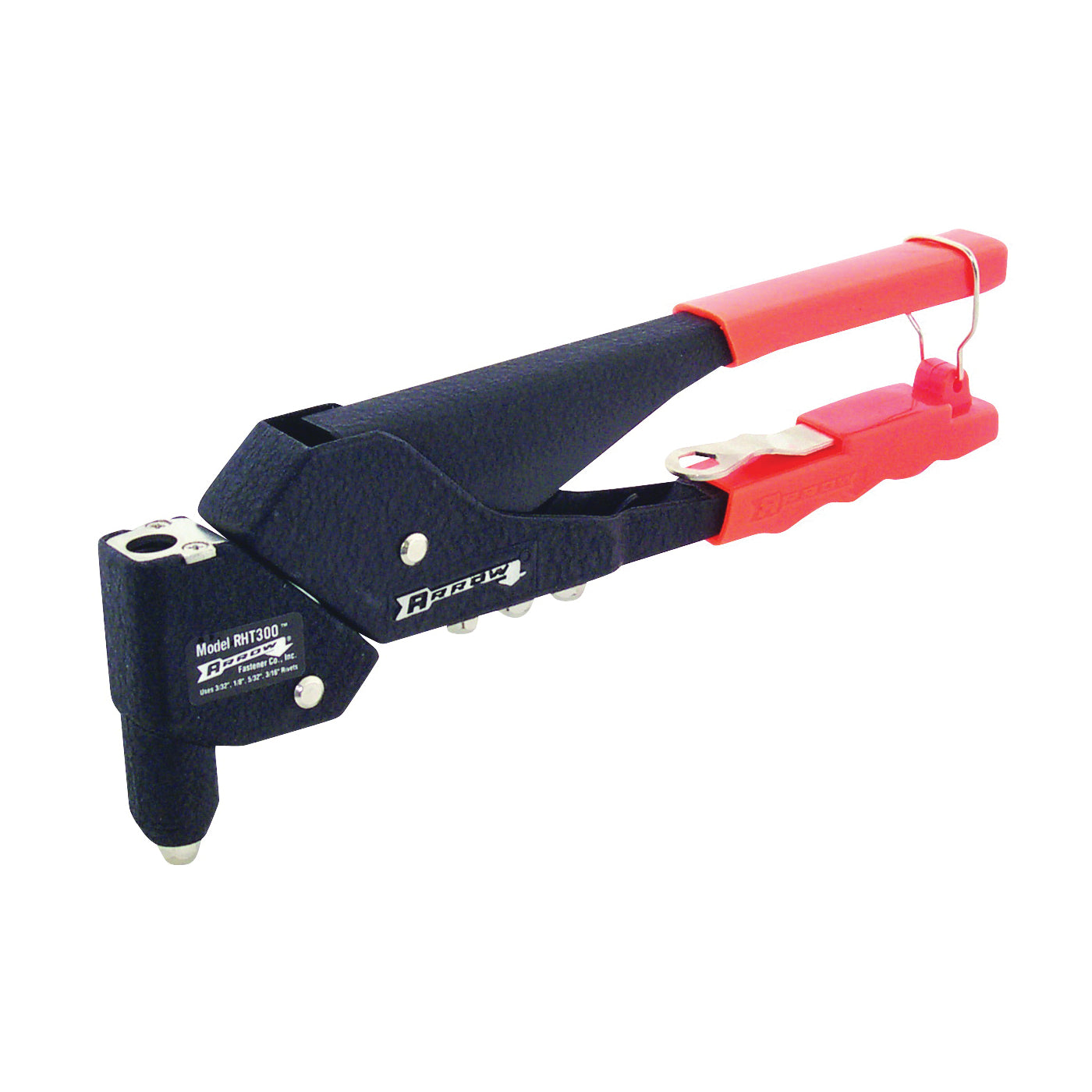 The Arrow RHT300 swivel head rivet tool is a true professional rivet tool with a full 360 deg swivel head and extended nose design that makes riveting in difficult corners, angles and tight spaces fast and easy. The tool features rugged all steel construction, spring loaded handles for easy loading, soft vinyl hand grips, four different size nose pieces, nose changing wrench and convenient handle lock for easy storage.