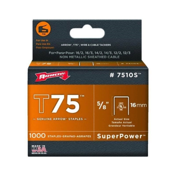 Arrow T75 Super Power Staple, Crown Shape: Flat, Crown Width: 1/2 in, Leg Length: 5/8 in, Suitable for: Staple Guns