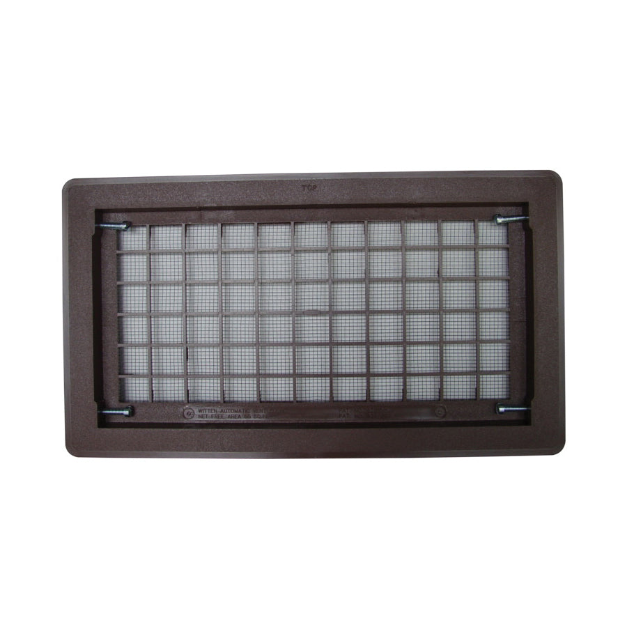 Grill with a flange and (4) screws to hold it in the foundation opening, has no flap or slide mechanism to open or close it, so the air can constantly move through. Size of 7-3/4 in x 15-1/4 in so it easily fits the standard 8 in x 16 in block foundation opening.
