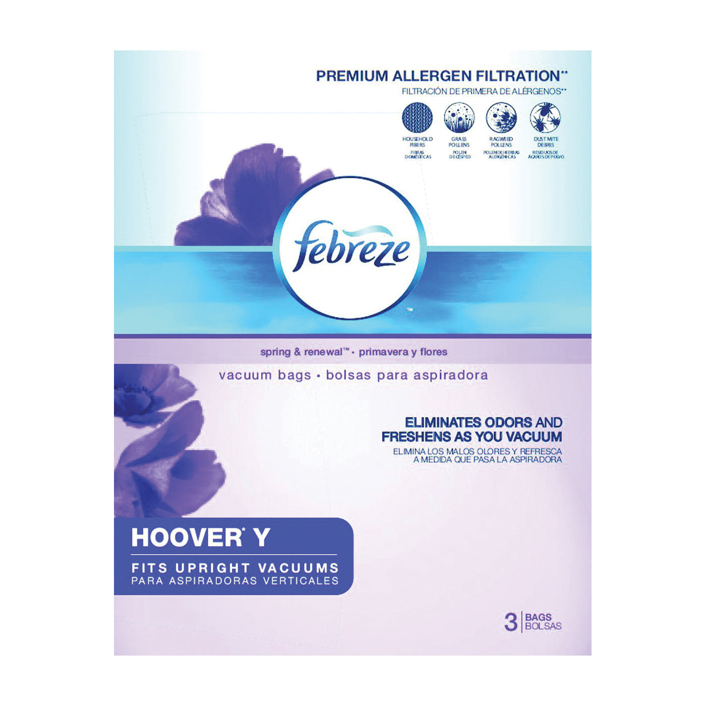 With Febreze® Spring & Renewal. Works with Hoover WindTunnel Uprights, Savvy Bagged and Tempo Widepath bagged. Eliminates odors. Freshens as you vacuum. Premium allergen filtration.