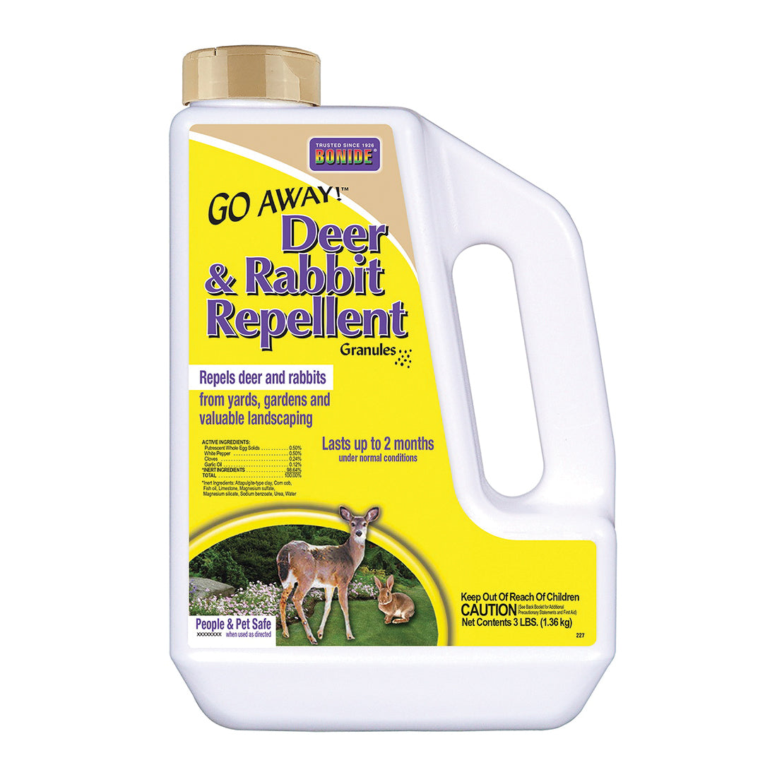 Repel deer & rabbits from your yard, garden and landscaping with Go Away! Deer & Rabbit Repellent Granules. Apply around your home, garden garage and more to begin deterring pests right away! Natural ingredients including white pepper, clove and garlic oil act as a natural irritant to animals, making your space undesirable without causing harm to animals. When used as directed, this product is safe for people and pets. This special formula is biodegradable and will not harm your lawn, garden, flowerbeds or other desirable landscaping. Go Away! Animal repellent is ready-to-use when it arrives! To use, simply apply the pellets to affected areas to begin controlling pests in your area. When used as directed, this long-lasting formula will help keep deer & rabbits away for up to 2 months at a time.