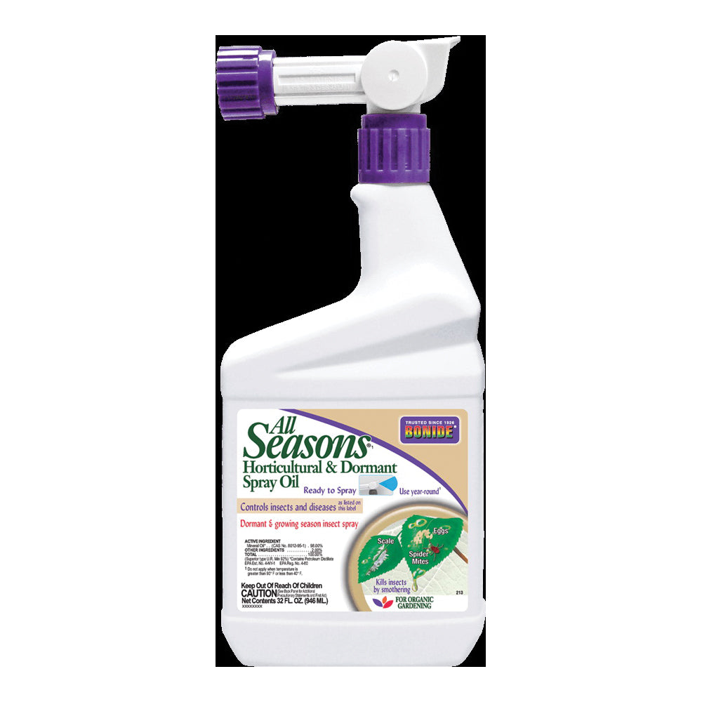 A superior type paraffinic oil that may be used as a growing season spray, dormant spray (no leaves) or delayed dormant (green tip) spray to control overwintering eggs of red spiders, scale insects, aphids, bud moths, leaf roller, red bug, codling moth, blister mites, galls, whitefly, mealy bugs and other insects. Highly recommended for use on fruit trees, shade trees, shrubs, ornamentals, roses and vegetables.