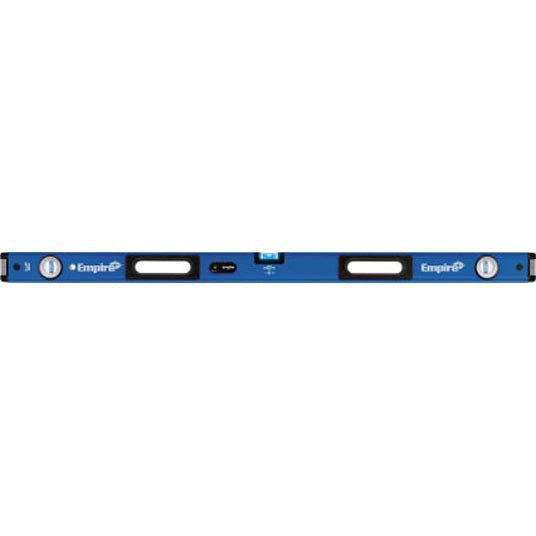 Empire True Blue Magnetic Box Level, Vial Type: Solid Block, Number of Vials: 3, Vial Material: Acrylic, Vial Positions: Level, Plumb, Accuracy: 0.0005 in/in, Number of Hang Holes: 1, Magnetic/Nonmagnetic: Magnetic, Aluminum, Blue, 48 in L, Includes: (2) AA Batteries