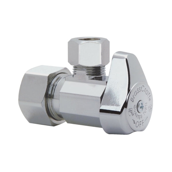 BrassCraft® 1/2 in Nom compression inlet x 3/8 in OD compression outlet 1/4-turn angle valve controls water flow to household plumbing fixtures like faucets, toilets, dishwashers, icemakers, washing machines. The angle valve is most often used where the water pipe enters the room from the wall. With a 90 deg turn of the valve handle, you are able to stop the flow of water leading to the plumbing fixture, allowing for maintenance and repair without shutting off the water to the entire home.