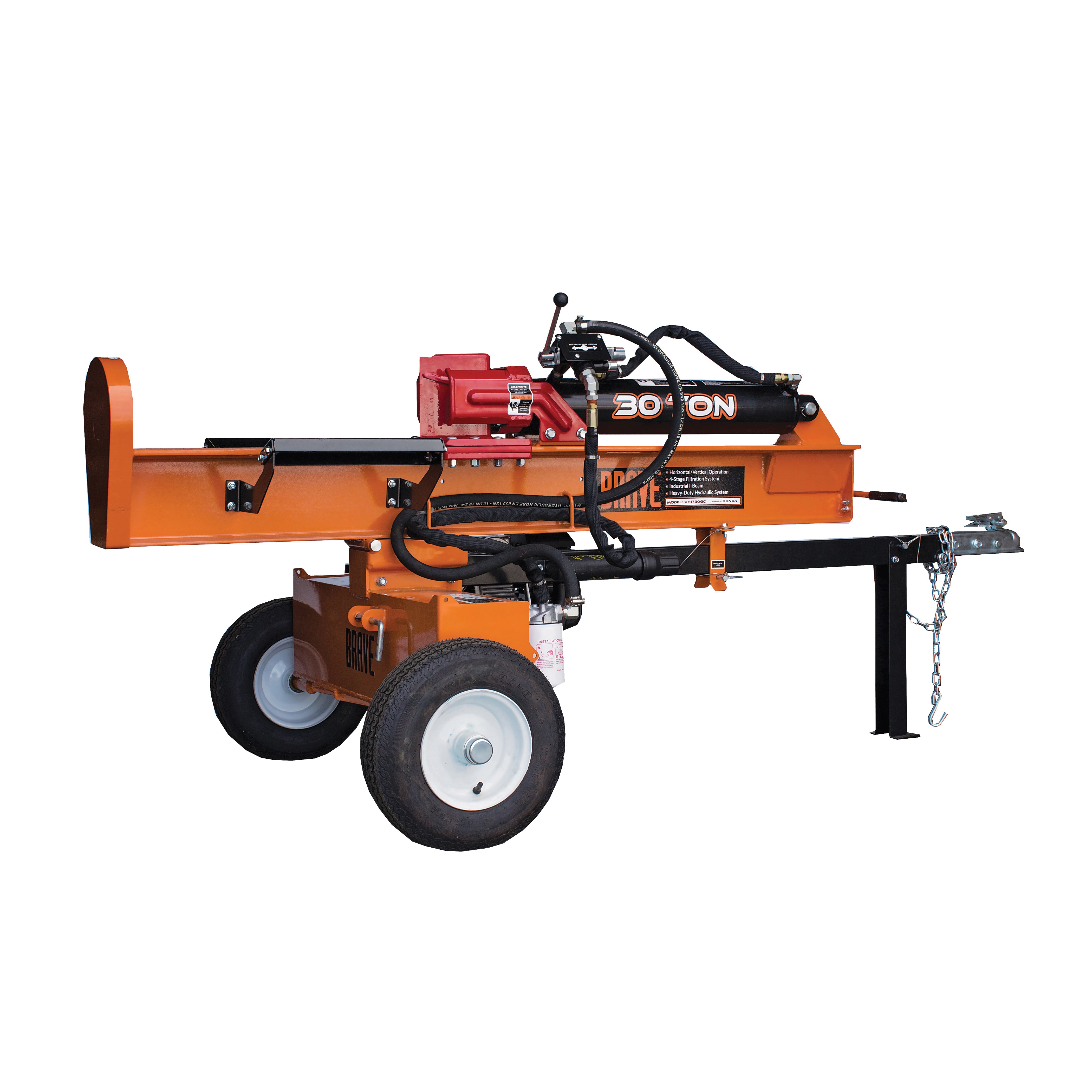 This professional quality log splitter is designed for tough applications in both vertical and horizontal positions. An attractive powder-coated finish provides the finest protection available and Brave's® rigid quality control and component testing help ensure years of productive, reliable service.