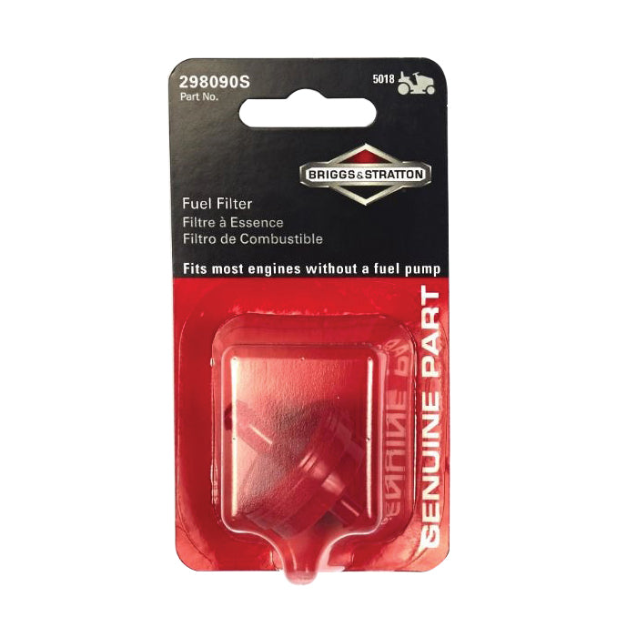 Display pack of 1 (298090S) fuel filter. This 150 micron fuel filter helps maintain fuel systems health by straining out foreign particles before they reach the carburetor. Designed for use on engines without a fuel pump, this OEM filter is used on Professional series and Extended Life series 7-15 HP engines and ensures proper fit and performance to maintain the life of your Briggs & Stratton engine.