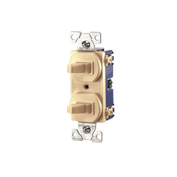 Grounding terminal screw standard. Combination switch with additional switch has 120/277 V rating, ideal for fluorescent lighting fixtures typical in commercial applications. 0.050 in thick steel mounting strap zinc-plated for corrosion resistance. Break-off provision for wiring both devices on same circuit or on separate circuits. Terminal screws backed out and ready for wiring. Side wire terminals accept up to #10 solid or stranded wire. Combination slot/Phillips head mounting and terminal screws. Switches meet all UL 20 requirements. UL listed.
