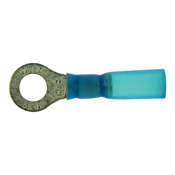 Heat shrink ring terminals are wire connectors that are used to mate, connect or terminate a single wire, while allowing for it to connect to a screw or stud type electrical connection. The heat shrink material completely seals the terminal and is the most durable insulation type for electrical connections. Heat shrink ring terminals can be used in auto and marine vehicles as well as other electrical applications.
