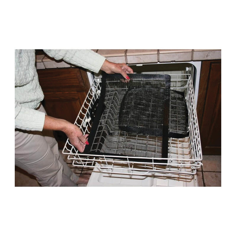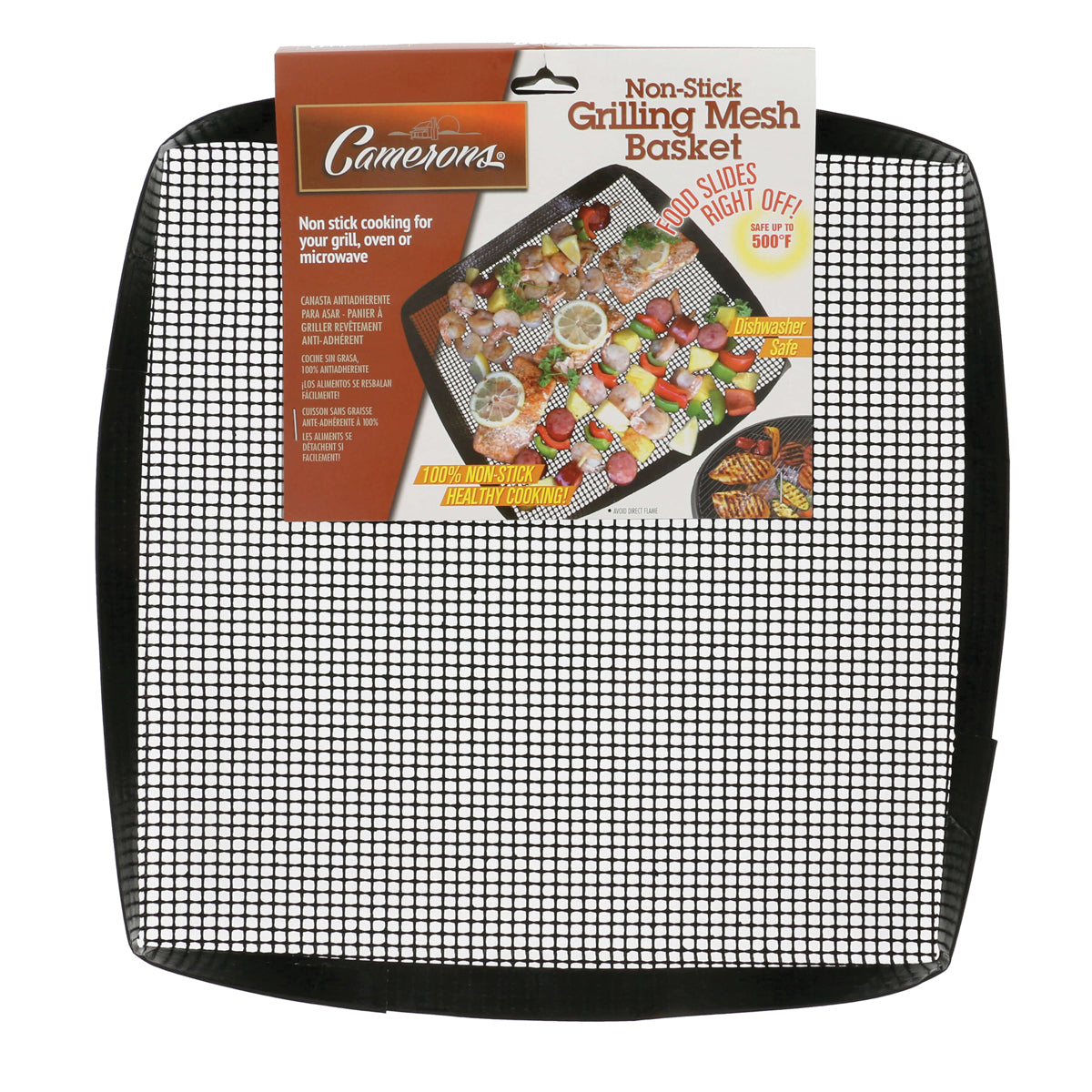 An easy way to cook and flip small items on the grill without risking dinner falling through the grates. Raised edges keep food on the mesh. PTFE material. Non-stick and easy to clean. Resistant up to 500 deg. For use on the grill, in the oven or the microwave. Reusable and dishwasher safe.
