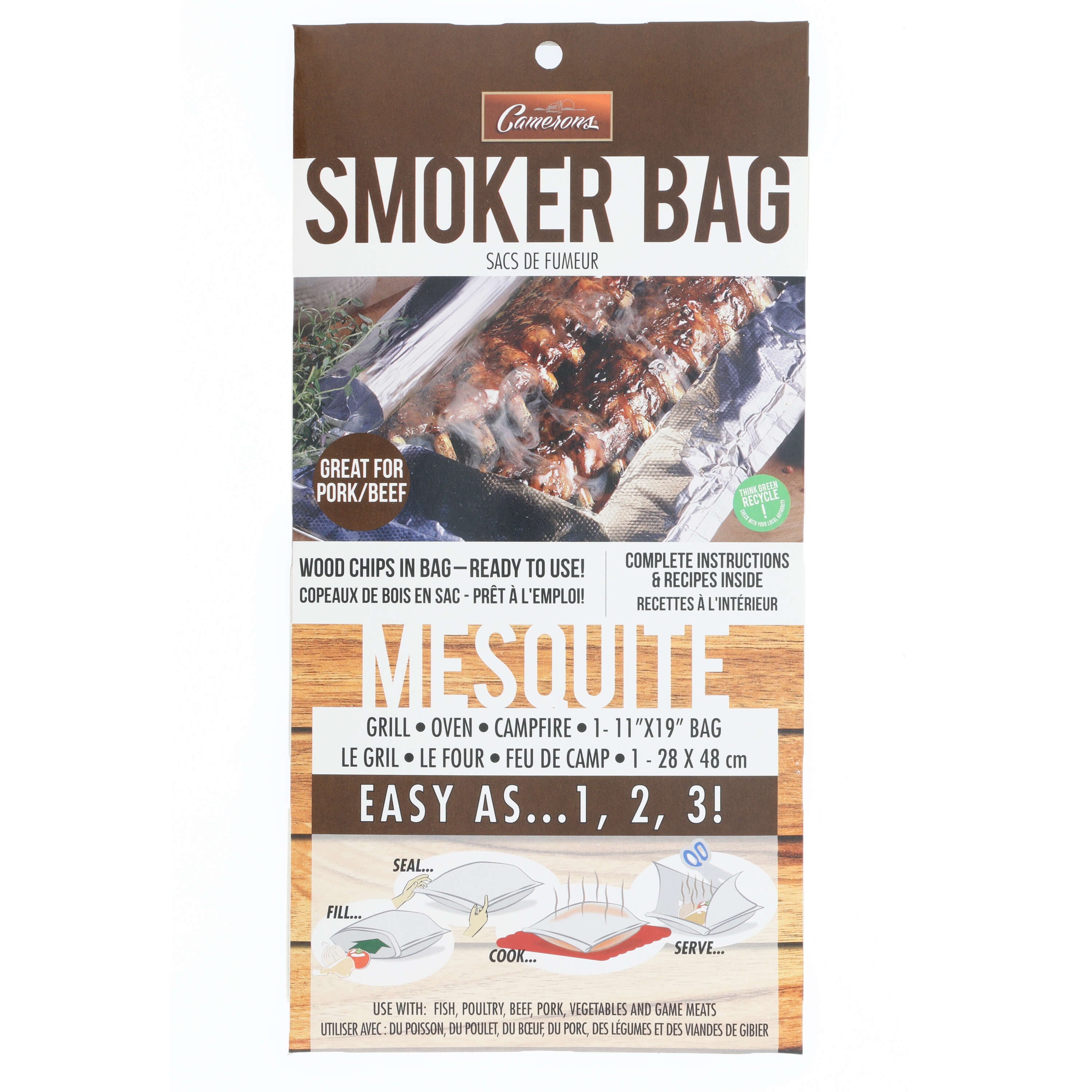 Smoking made easy in a tri-level aluminum foil bag with hickory, mesquite or alder flavored wood chips to give the perfect flavor every time in the oven, on the gas or charcoal grill, a hot plate, campfire or on Camerons grills. Recyclable with no clean-up. Comes with full instructions and recipes. Smoker bags make smoking at home so easy. Season the food and slide it into the bag, fold the end of the bag over three times and press down hard to seal. Follow the directions on the cover of the bag for oven or grill cooking. Always start the cooking with a high-heat for 10 min to get the wood to smoke in the bag and then turn the temperature down to finish the cooking. The heat must come from directly underneath the smoker bag for best results. No oil or fat should be added.