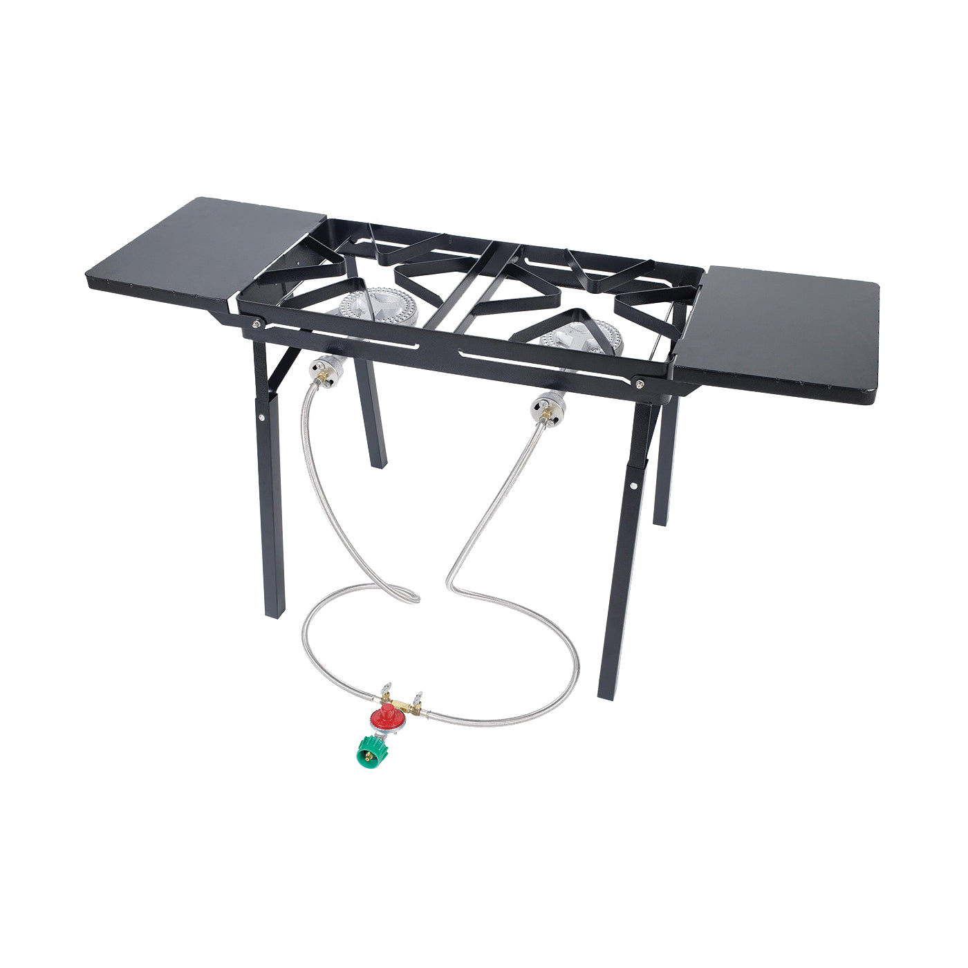 Designed for versatility - bare simmer to high flame. Large cooking surface measures 14-1/4 in x 28-3/4 in. 13 in tall welded steel frame. Locking extension Legs raise height to 25 in. Dual burners. slide and lock side shelves. 10 psi pre-set regulator with dual brass control valves. Dual 36 in LPG stainless braided hose. Designed for pots up to 62 qt.