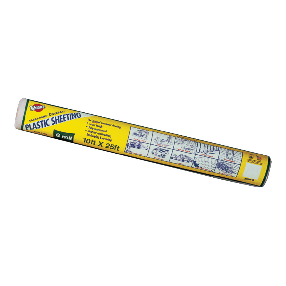 Super tough, fully waterproof plastic sheeting used by DIYers and contractors for large and small construction, landscaping or covering projects. Warp's shelf-pack, wrapped on a solid core, will sit upright on a shelf or horizontally in a bin with vertical design on front panel and horizontal on rear for flexibility in displaying. Consumer.