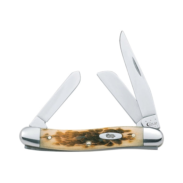 Stockman packs three blades in a convenient but very practical pocket knife. The clip and sheepfoot blade sit on the pocket end while the spey blade sits on the cap end. The clip blade is commonly used as a multi-purpose blade and preferred for detail work. The sheepfoot blade allows for added strength at the point making it great for carving and achieving a clean cut. The spey blade is commonly used as an all-purpose utility blade. This knife is constructed with CASE Tru-Sharp™ stainless steel which is a special high-carbon steel that helps the blades hold an edge longer than conventional steel. It also offers extraordinary blade strength and corrosion resistance.