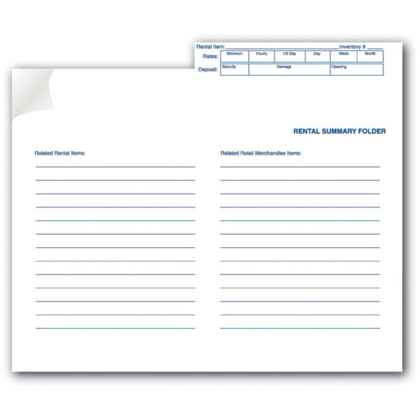 Keep all of the information on your rental equipment in one place. Item, rates, deposit, related rental and merchandise sale items and more. Our rental summary folder is designed to help you keep track of it all. Constructed from durable heavy-weight stock.
