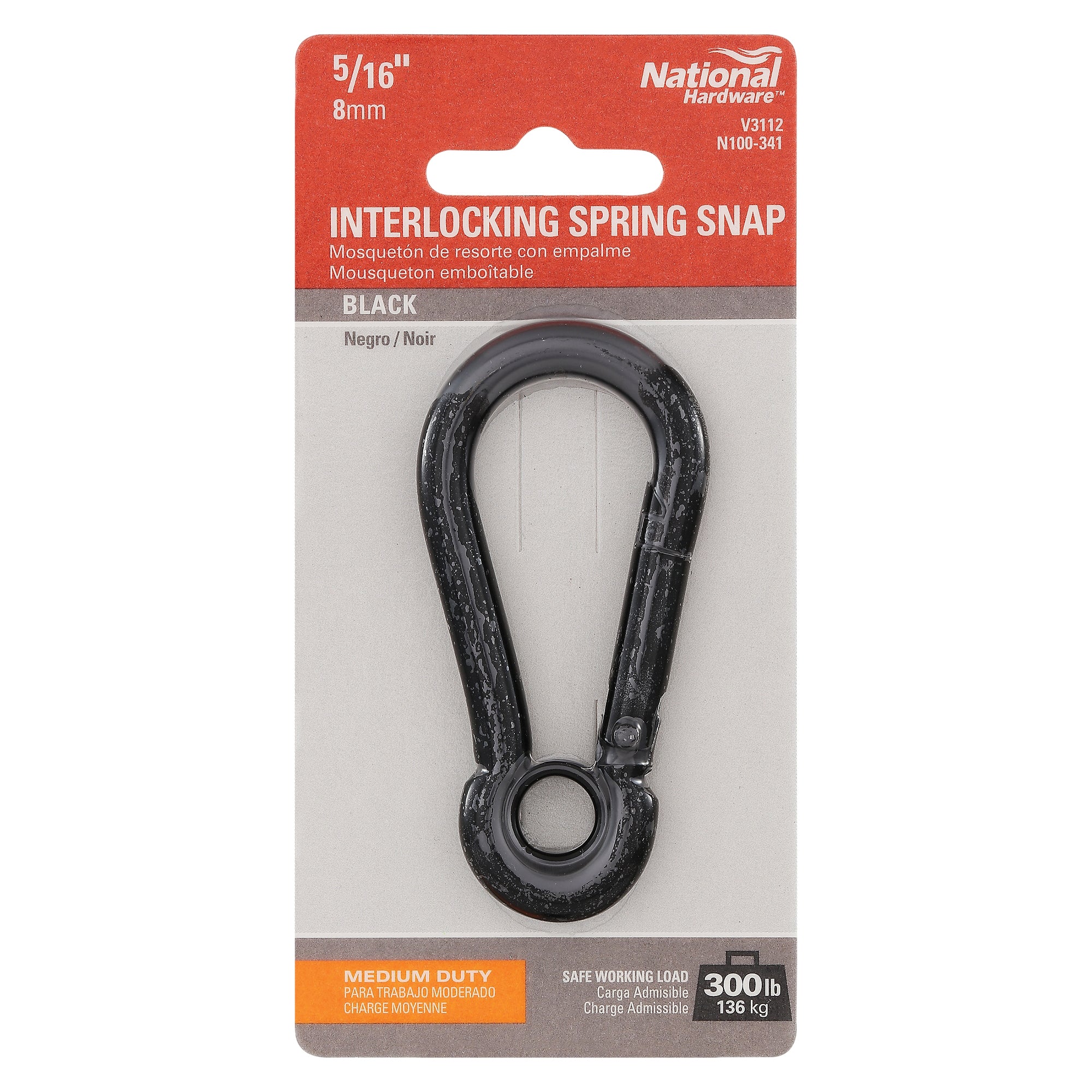 National Hardware Interlocking Spring Snap, Working Load Limit: 300 lb, Trade Size: 5/16 in, Snap Opening Size: 3/8 in, Wire Diameter: 5/16 in, Stainless Steel/Steel, Black, Dimensions: 3-5/32 in H x 1-19/32 in W, Suitable for: Rope