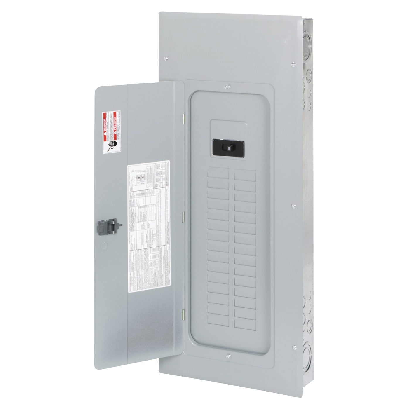 Galvanized steel enclosure. Single phase, 3-wire, insulated/bondable split neutral, 30 (1 in) spaces, 40 poles, 120/240 V. Main breaker type BW at 25,000 AIC. Ground bar kit (necessary for sub-feeding) sold separately. Tin-plated aluminum bus bar. Twin neutral with non removable cross bus. When bonded, unused neutral connections may be used for equipment ground protectors in service entrance application. #2 - 300 kcmil wire range. Electrostatic powder coat, baked urethane painted. Rotates 180 deg for bottom feed; orientation of main breaker handle consistent with NEC 240-81 requirements because it operates horizontally. G1 box - 14-5/16 in W x 34-1/8 in H x 3-7/8 in D. UL listed file E52977.